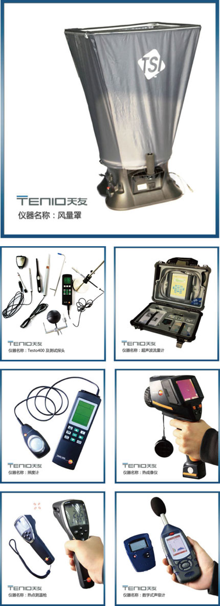 為了提高公司的設計水平,更好的為客戶提供顧問式服務,天友公司暖通專業購買了一批從德國、美國進口的暖通測試設備,設備包括:多功能測試儀及外配的溫濕度探頭、風速探頭(葉輪、熱線)、CO2探頭、舒適度探頭、壓差探頭(可測風壓、水壓),另外還購置了紅外熱像儀、紅外熱測溫儀、風量罩、超聲波流量計、聲級計、照度計等。